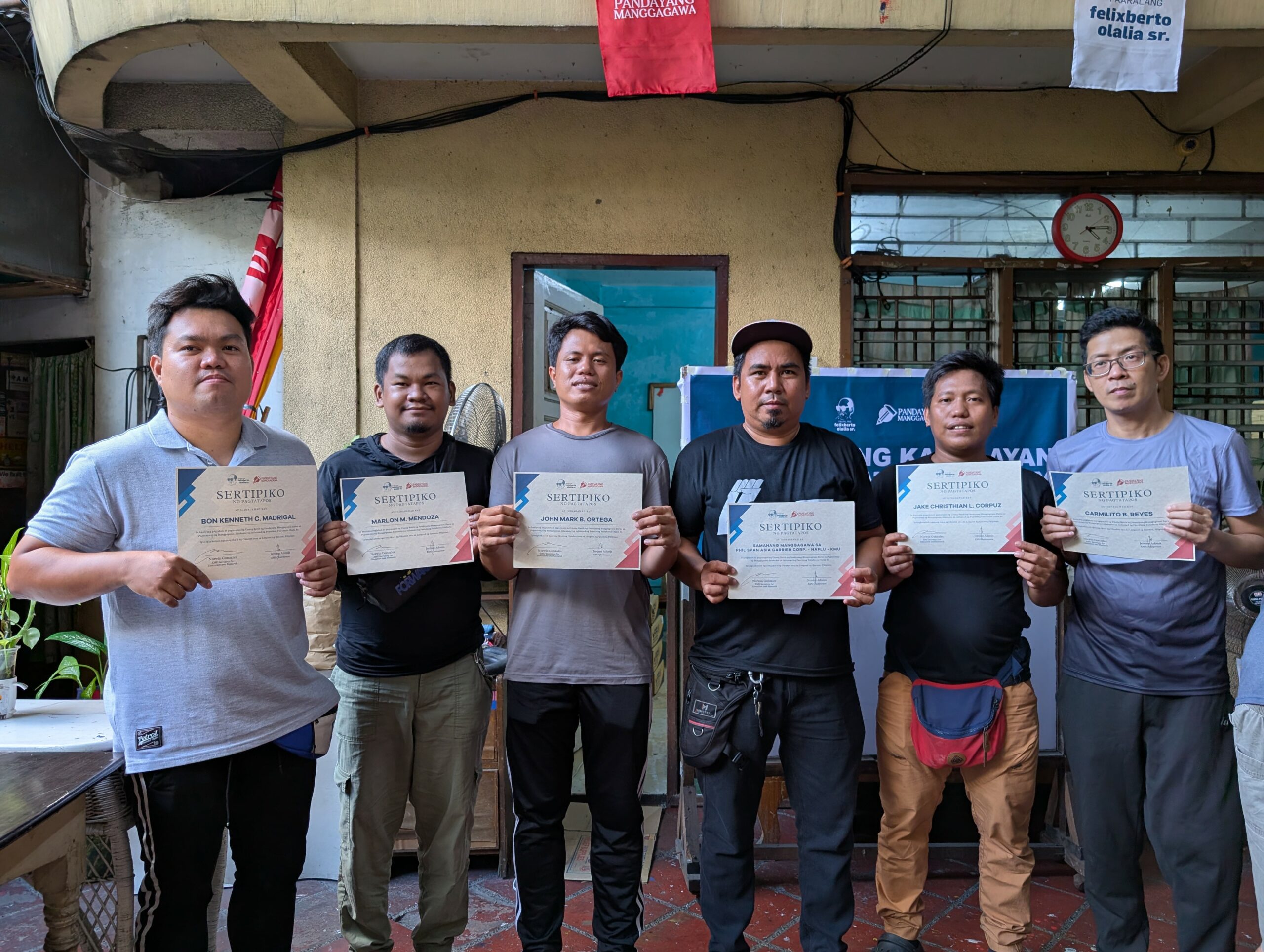 The graduates came from the Samahang Manggagawa sa Phil Span Asia Carrier Corporation – NAFLU – KMU, Gabay ng Unyon sa Telekomunikasyon ng mga Superbisor – PLDT, and Migrante Philippines. The Pandayan was launched by the Felixberto Olalia Sr. School to develop the knowledge and skills of workers and unionists in carrying out educational work in their respective areas of organizing.